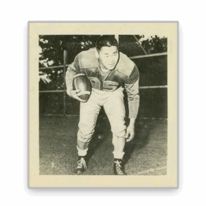 The cards from the 1956 Parkhurst set measure 1 3/4″ x 1 7/8″, were printed on photo stock, and the fronts originally came undeveloped; each pack provided sheets of developing paper for collectors to expose the photographs themselves, making this series extremely unique among sports cards of its era. Collectors value Kwong’s cards not only for its historical significance in Canadian football but also as a representation of a trailblazer who contributed greatly to sports and society in Canada. Another popular 1956 card of Kwong is the Shredded Wheat #7B, beloved for its contrasting black and white photo with a bold, colourful background.