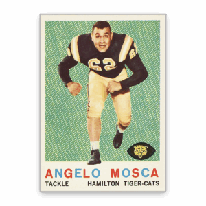 Collectors are captivated by his 1959 Topps rookie card for its striking photo, which pictures Mosca charging directly toward the camera, showcasing his intense eyes, and remarkable size and speed. The 1959 Topps set was the company’s second CFL release and is considered a landmark issue that also features Russ Jackson’s rookie card.