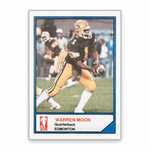 Moon’s 1983 JOGO card is considered the key card of modern CFL collecting and anchors a set that marked the league’s return to standard-sized trading cards after 11 years. Sometimes called the “1986 Fleer Basketball” of CFL cards, the unnumbered ’83 JOGO set features several of the first standard pro cards of stars like Tom Clements, Dieter Brock, Mervyn Fernandez, Lui Passaglia, Condredge Holloway, Rocky DiPietro, and future U.S. Congressman J.C. Watts. With only 900 complete sets produced — 600 sold to the public and 300 distributed to players — the set’s limited availability and stellar rookie checklist have cemented its legendary status among collectors. Warren Moon’s very first CFL card, is part of the inaugural JOGO set from 1981. The set is known for its oversized dimensions (5” x 3.5”) and black-and-white design, giving it a distinctive and classic look.